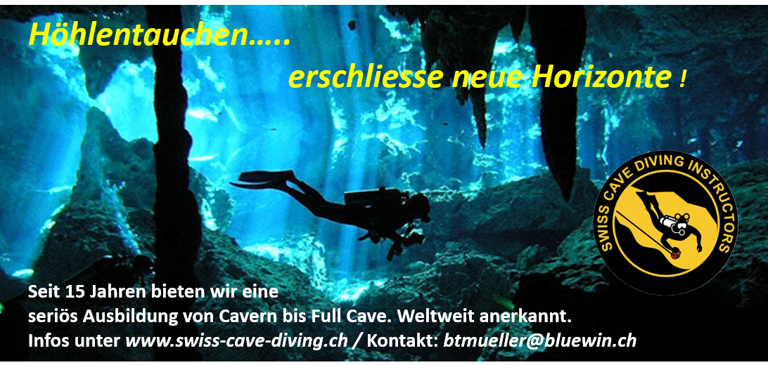 | 05.01.2013 | Ausbildungskurse Swiss Cave Diving 2013 An alle interessierten Taucher, welche sich im Bereich Höhlentauchen weiterentwickeln wollen. Hier unsere Kursdaten 2013: Schweiz: 23.02. / 24.02.2013 Theorie HT 1/2/3 16.03. / 17.03.2013 Praxis HT 1/2 Praxis Freiwasser 13.04. / 14.04.2013 Praxis HT 3 Praxis Freiwasser Frankreich: 11.05. 17.05.2013 Praxis HT 2 18.05. 24.05.2013 Praxis HT 3 11.05. 17.05.2013 Begleitetes Tauchen ab HT 2 18.05. 24.05.2013 Begleitetes Tauchen ab HT 2 100% Kursbesuch ist Voraussetzung. Für HT2 oder Kombikurse HT1/2 mind. 2 Jahre Taucherfahrung und 100 geloggte Tauchgänge. Kursangebot + Preise Anmeldung / Info zu Frankreich Mail an Kursorganisator |